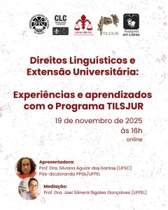 A palestra “Direitos Linguísticos e Extensão Universitária: experiências e aprendizados com o Programa TILSJUR” propõe uma reflexão sobre: (i) o percurso trilhado pelo TILSJUR e a formação de redes comunitárias e institucionais; (ii) a articulação entre ensino, pesquisa e extensão no campo dos direitos linguísticos, com foco na formação de tradutores e intérpretes de Libras-Português e no letramento jurídico de comunidades surdas; e (iii) as perspectivas futuras para a interface entre direitos linguísticos, políticas de tradução e políticas linguísticas. O encontro busca evidenciar como a extensão universitária pode se constituir em um espaço de produção de saberes jurídicos, linguísticos, culturais e tradutórios, de inovação social e de efetivação dos direitos linguísticos.