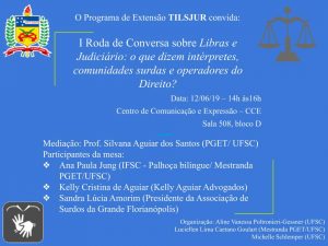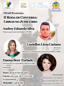 2) Língua e Direito: a garantia ao intérprete de Libras no Judiciário (Luciellen Lima Caetano Goulart – Mestranda Programa de Pós-Graduação em Estudos da Tradução – UFSC);